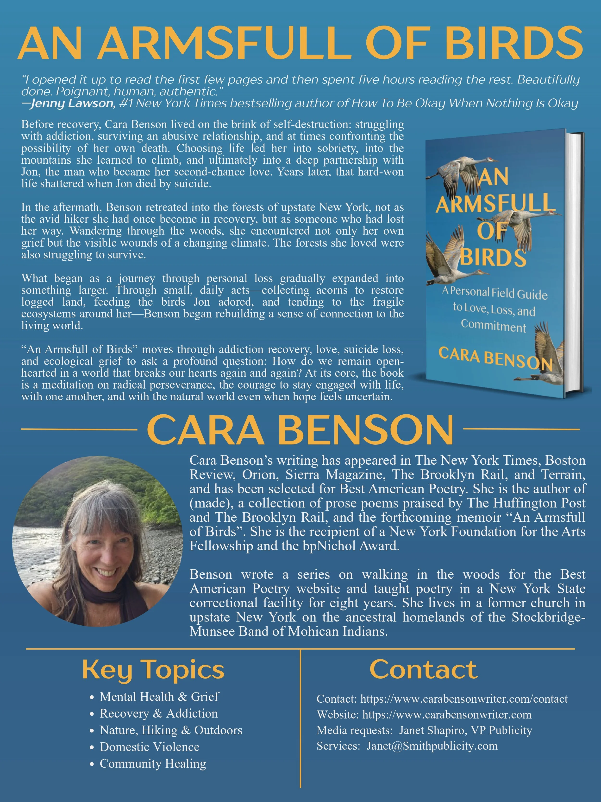 “Cara Benson feels everything so deeply and tells her stories so honestly. Part recovery story, part eco-travelogue, part grief memoir, An Armsfull of Birds is a nuanced, thoughtful book about what it means to live fully, even when that means surviving your most beloved people. A memoir that will break your heart and put it back together again.”