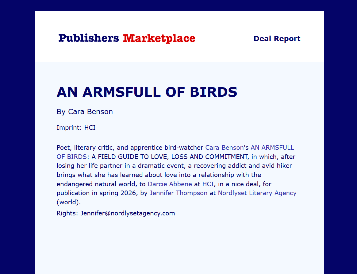 It’s on, folks. I signed on the (not dotted) line with HCI Books for my memoir An Armsfull of Birds: A Field Guide to Love, Loss, and Commitment. I’m thrilled, I tell you, thrilled. My editor Darcie Abbene is a writer herself so she gets it. I couldn’t be happier with the people in my corner for this, which includes my agent Jennifer Thompson of Nordleyset Literary Agency. It’s a big deal to me, this book. This story. My love for Jon. I hope you’ll root for me, too. <3